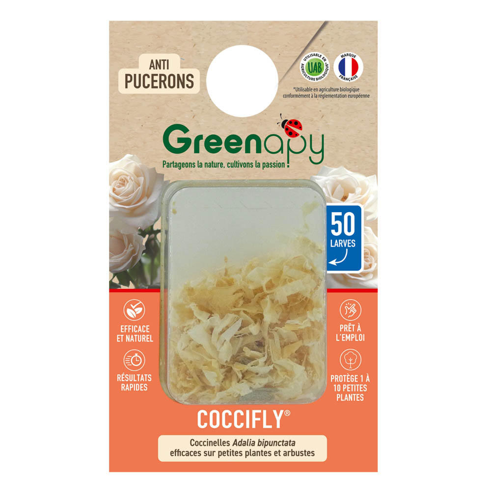 Protégez vos fleurs et légumes sans pesticides ! Le pack de 50 larves de coccinelles Coccifly® (Adalia bipunctata) est l’arme biologique idéale pour éradiquer les foyers de pucerons dès leur apparition. Véritables prédatrices indigènes, ces larves assurent un nettoyage en profondeur de vos plantes d’ornement et de votre potager.
