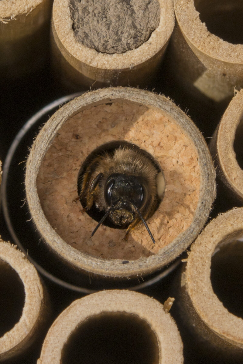 Le tube contient environ 20 cocons d’abeilles maçonnes rousses. Il est facile à installer et ne requiert aucun entretien particulier.