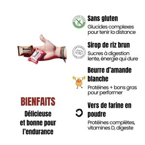 Grâce à l’ajout de farine de vers broyés, cette barre fournit une source de protéines complètes, favorisant la récupération musculaire et l’endurance.