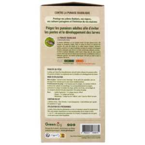 Ce piège astucieux se compose d’une cuve transparente, de cônes intérieurs et d’ailettes optimisées pour le piégeage. Son efficacité est renforcée par l’utilisation d’une phéromone d’agrégation et sexuelle spécifique, attirant les punaises diaboliques à tous les stades de leur développement.