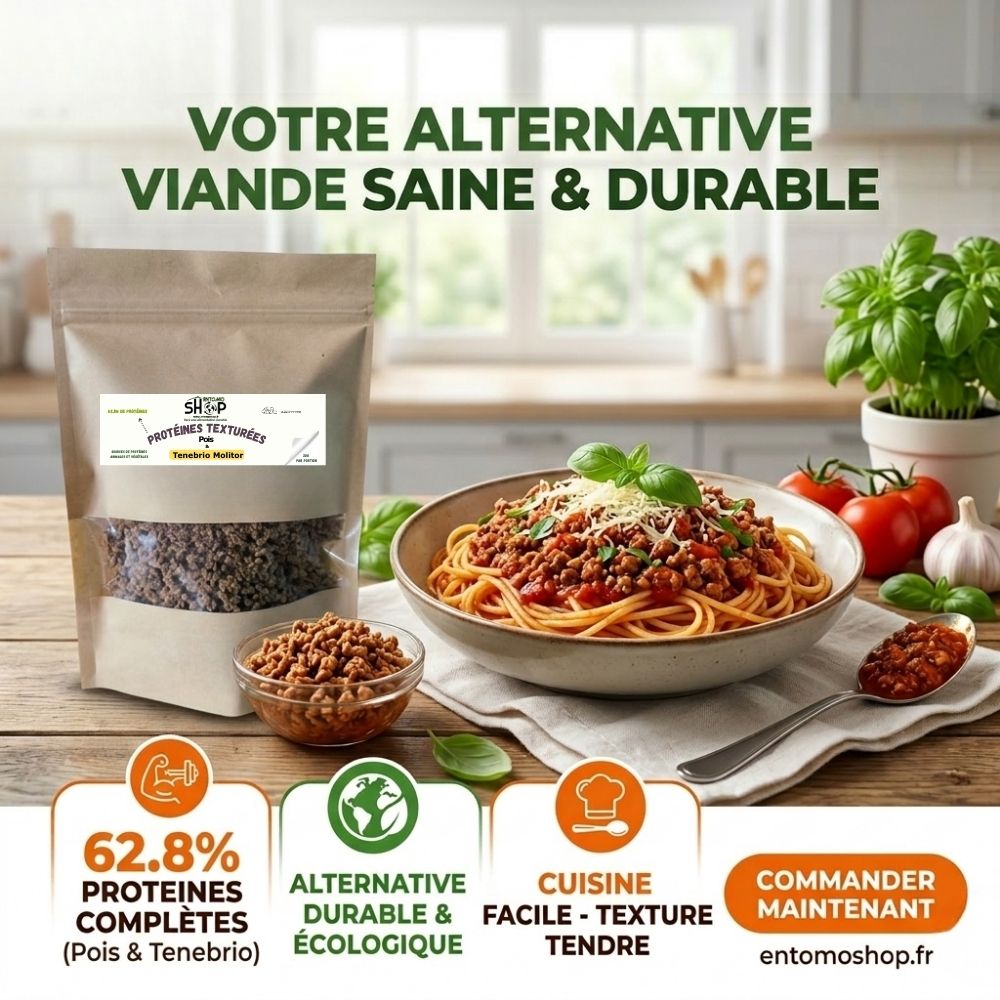 1. Quel est le goût des protéines texturées de Tenebrio ? Le goût est très subtil, avec des notes légères de noisette, de pois et de céréales grillées (Umami). Une fois réhydratées et cuisinées en sauce (bolognaise, chili, farce), elles absorbent les saveurs de vos épices et condiments. La texture est bluffante : elle offre une mâche tendre et juteuse, très proche de la viande hachée de bœuf.