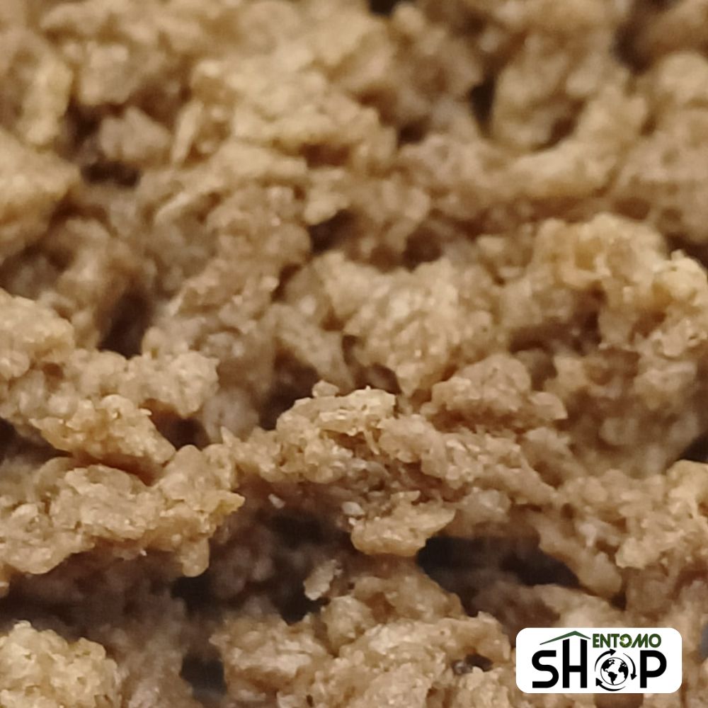 • Composition : 40% poudre d’insectes entiers Tenebrio Molitor, isolat de pois, concentré de pois, émulsifiant, antioxydant.