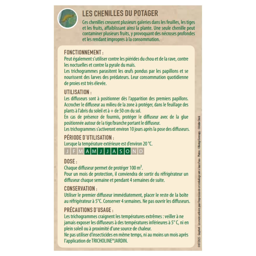 Vivant : Les trichogrammes sont des organismes vivants ; respectez bien les consignes de pose dès la détection des papillons pour qu’ils puissent parasiter les œufs avant leur éclosion.